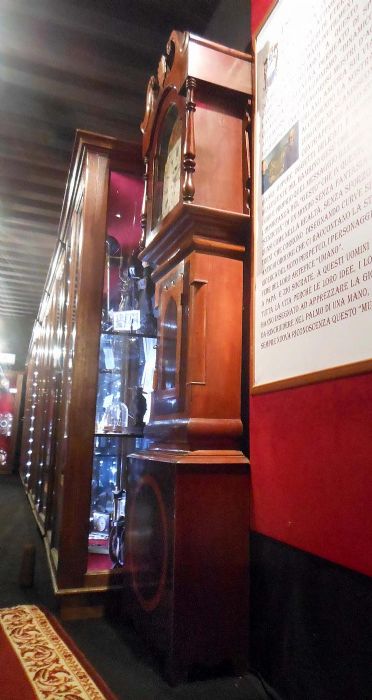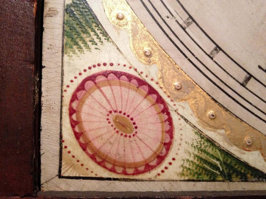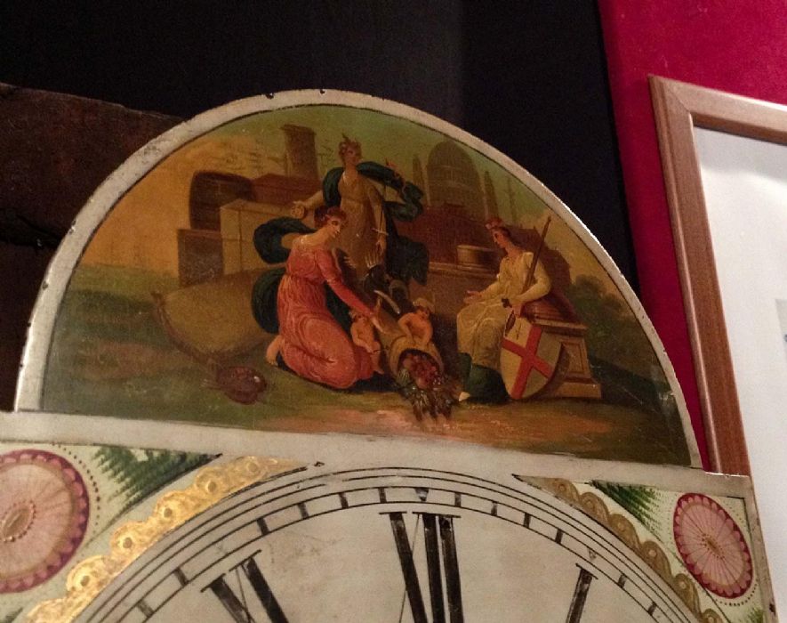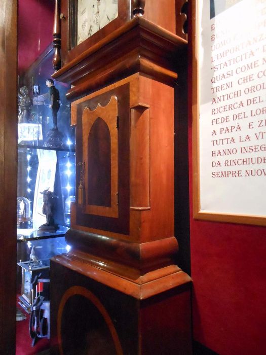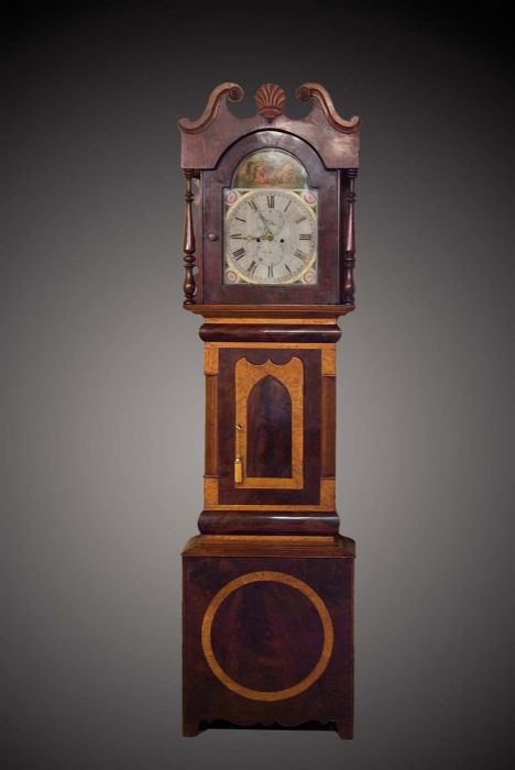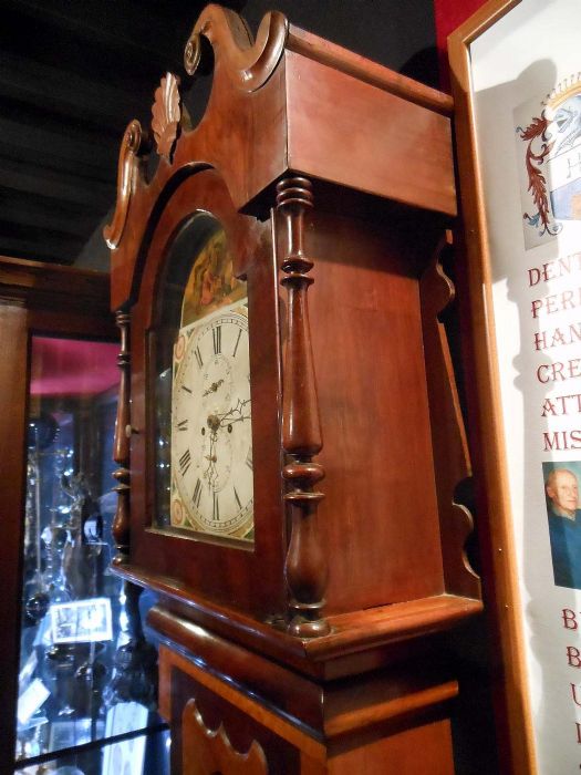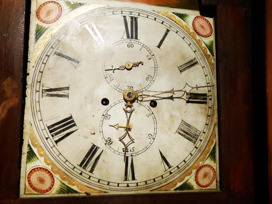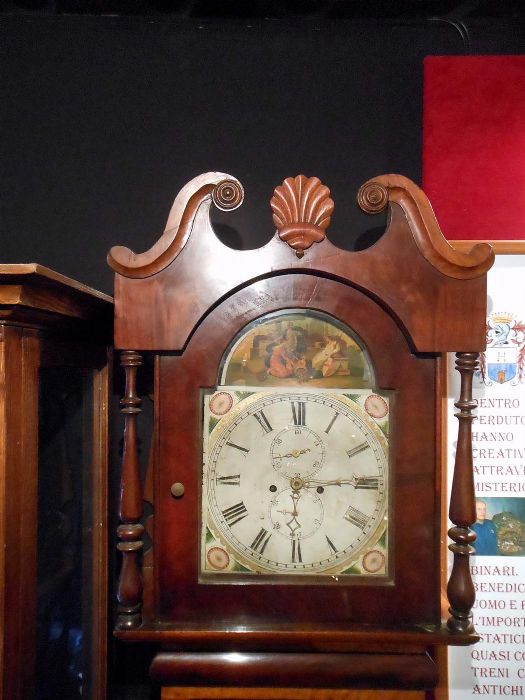 Orologio a cassa lunga in mogano con quadrante dipinto a olio e motivi floreali allegorici. Mostrina con datario (in basso), ore, minuti e secondi (in alto).