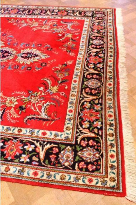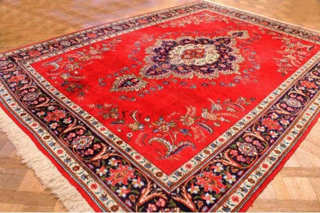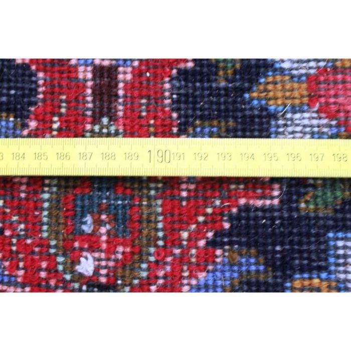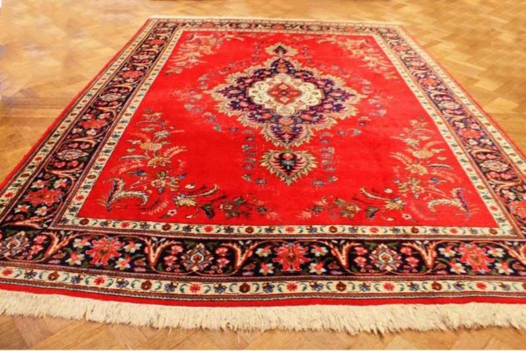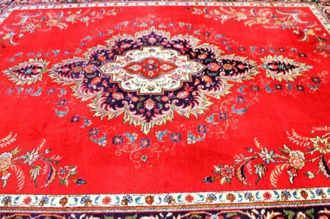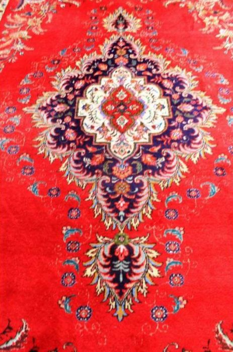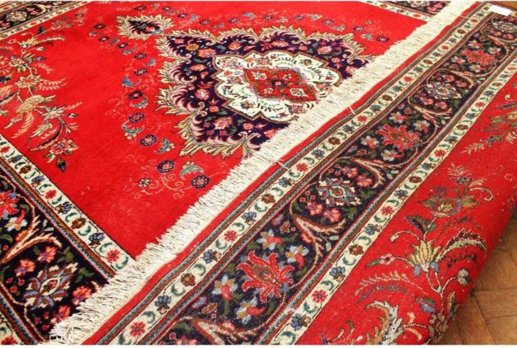 Antico TABRITZ floreale caratterizzato da decori naturalistici che circondano una campitura interna in vivacissimo “rosso cardinale” con caratteristico rosone centrale concentrico a forma di rombo. Annodato completamente a mano, in purissima lana con trama e ordito in cotone e con bordature e frange ben conservate. Il tappeto ha circa 70 anni.