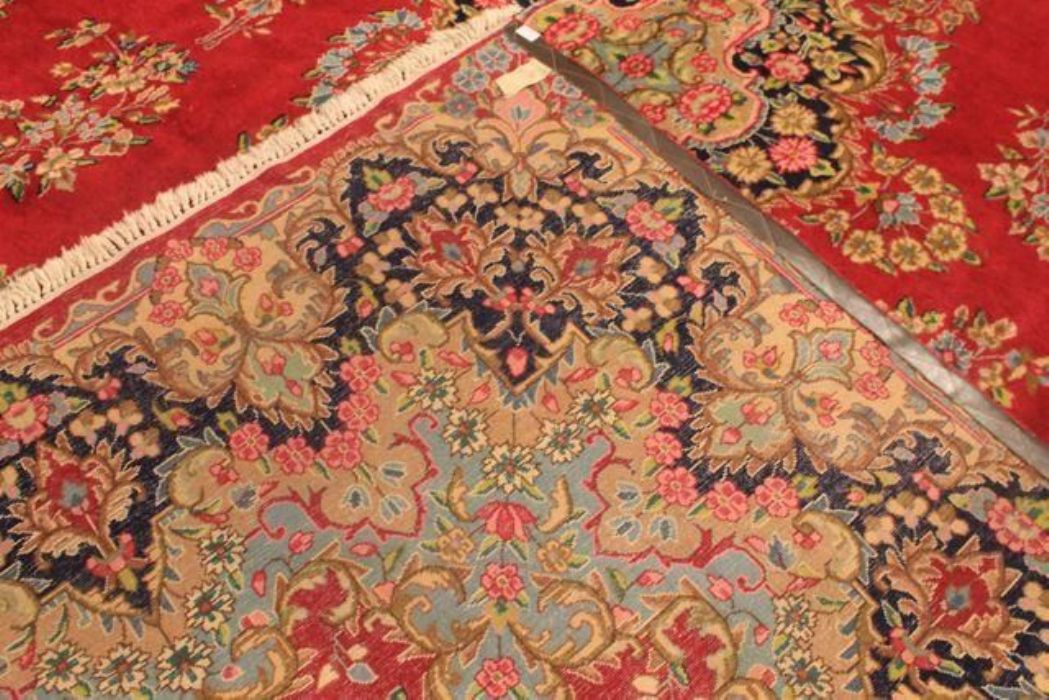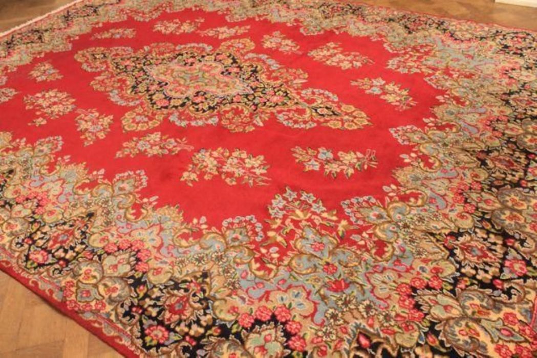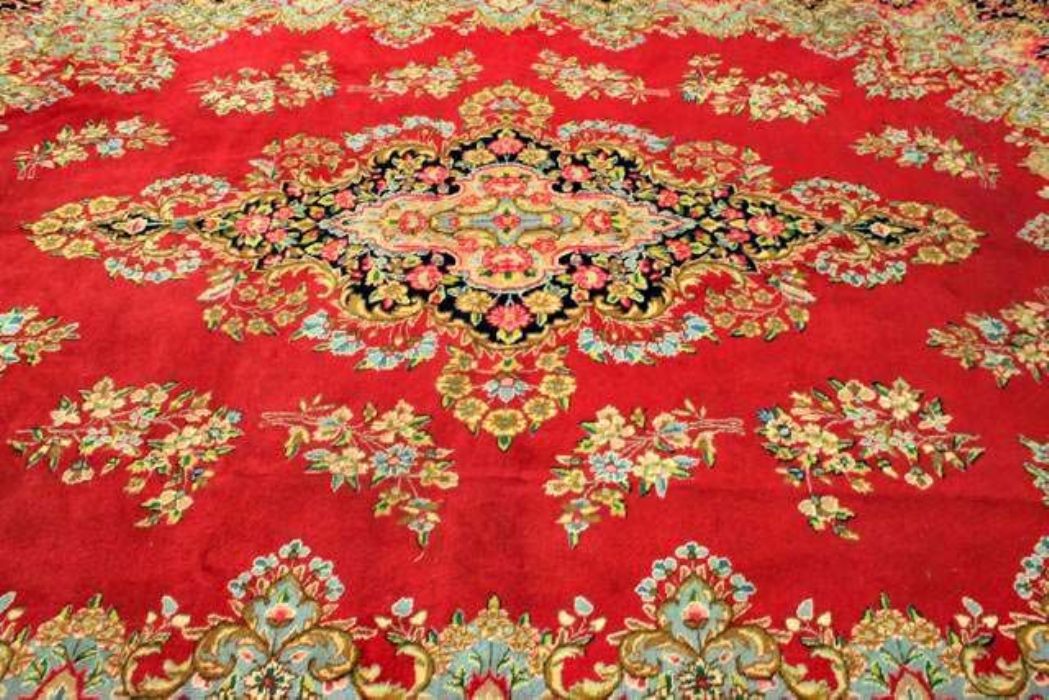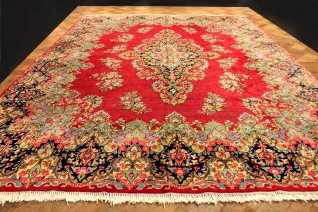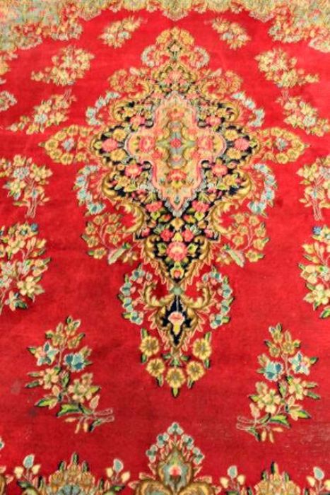 Meraviglioso e classico KIRMAN ( KIERMAN) LAVER di grandi dimensioni con decori floreali e tradizionale grande rosone centrale a forma di rombo con “ isole fiorite” all’interno della campitura rosso carminio. L’annodatura strettissima a mano, l’estrema qualità dei fiori e dei racemi intessuti con arte sopraffina, i vivaci colori vegetali, rendono il decoro del tappeto quasi tridimensionale. Un effetto ottico di particolare spettacolarità reso più evidente da qualità e spessore del vello di pura lana. La trama e l’ordito sono in cotone, le frange e la bordatura si presentano in buone condizioni. Tappeto perfetto di circa 70 anni, fra i più pregiati nel panorama degli antichi persiani.