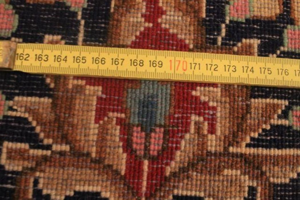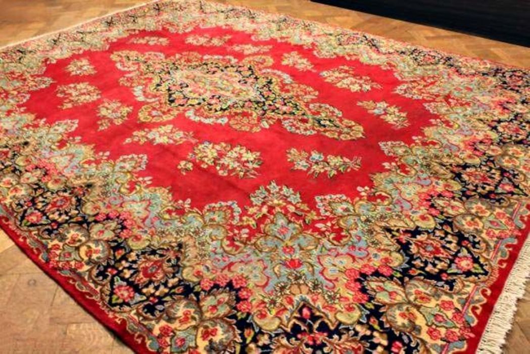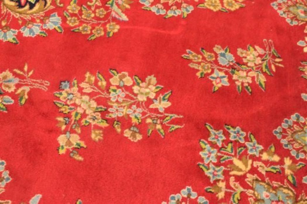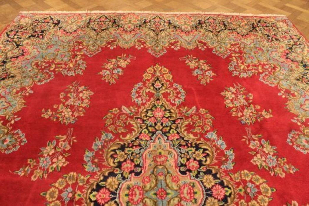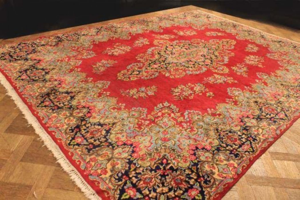 Meraviglioso e classico KIRMAN ( KIERMAN) LAVER di grandi dimensioni con decori floreali e tradizionale grande rosone centrale a forma di rombo con “ isole fiorite” all’interno della campitura rosso carminio. L’annodatura strettissima a mano, l’estrema qualità dei fiori e dei racemi intessuti con arte sopraffina, i vivaci colori vegetali, rendono il decoro del tappeto quasi tridimensionale. Un effetto ottico di particolare spettacolarità reso più evidente da qualità e spessore del vello di pura lana. La trama e l’ordito sono in cotone, le frange e la bordatura si presentano in buone condizioni. Tappeto perfetto di circa 70 anni, fra i più pregiati nel panorama degli antichi persiani.