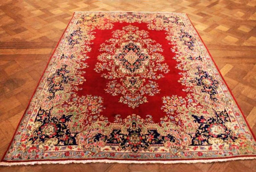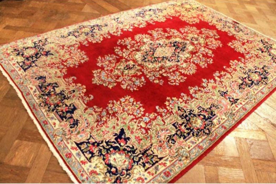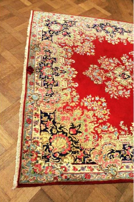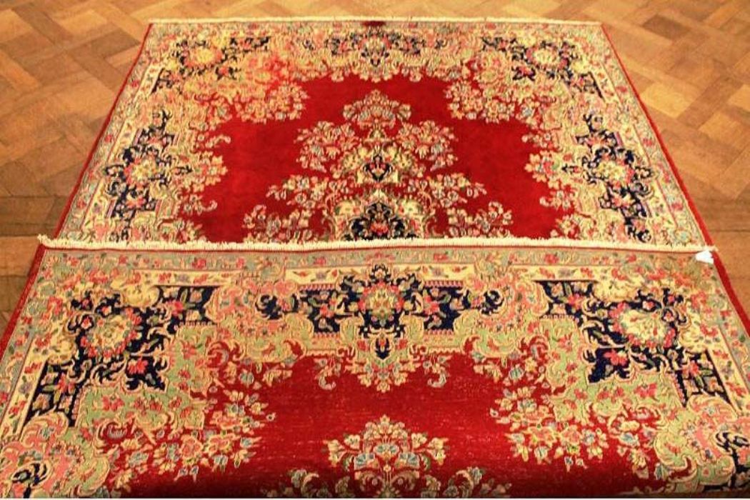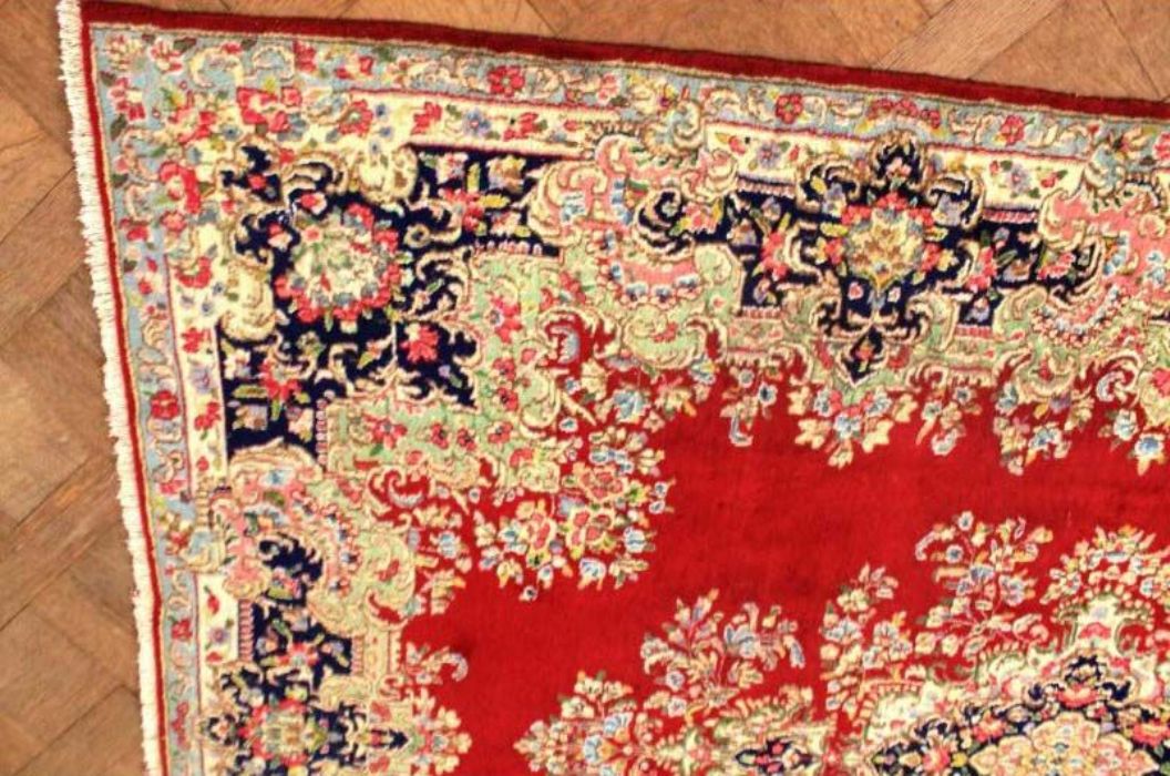 Raro e perfettamente conservato esemplare di antico KIRMAN (KIERMAN) IMPERIALE con decori a motivi floreali su classica campitura rosso cardinale. Eccezionale effetto naturalistico dei decori che danno spessore alla trama e all’orditura dei disegni. Il vello è in pura lana con trama e ordito in cotone, annodato completamente a mano. Ben conservate la bordatura e la frangia. Colori vegetali. Il tappeto, che è firmato , ha circa 60 anni.
