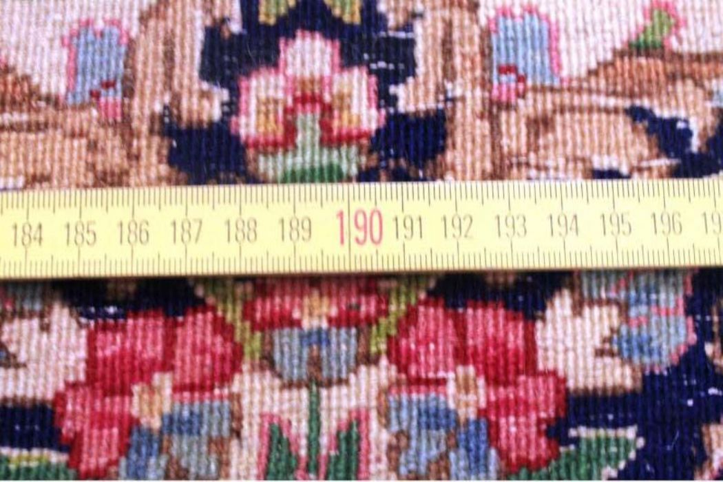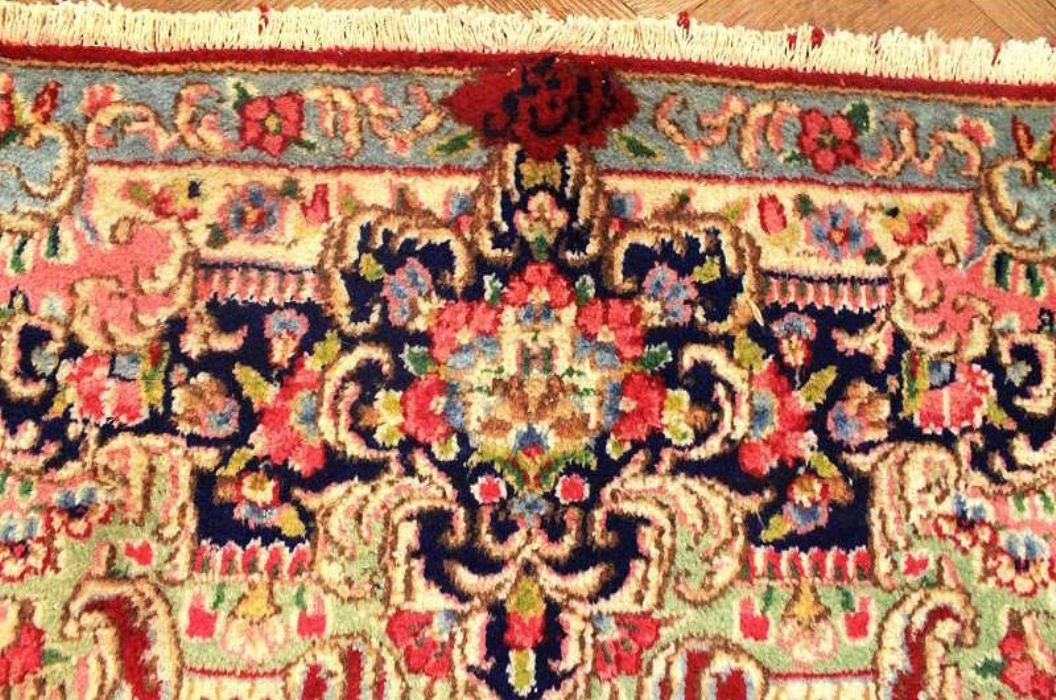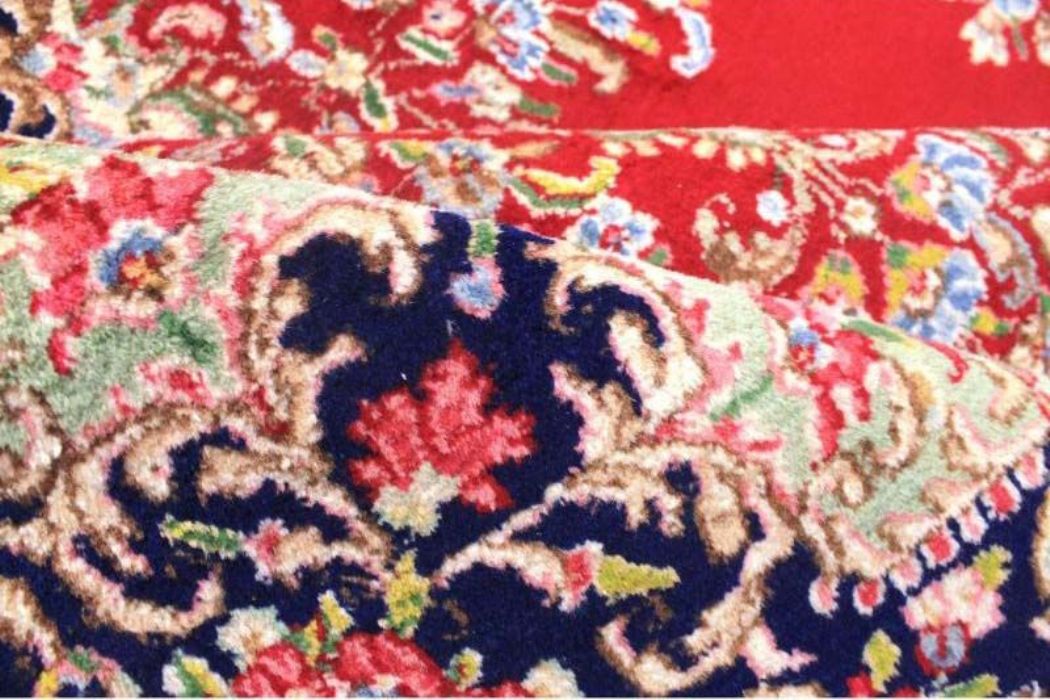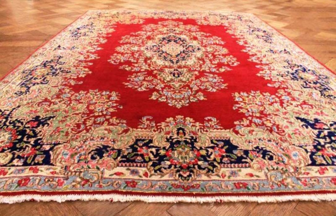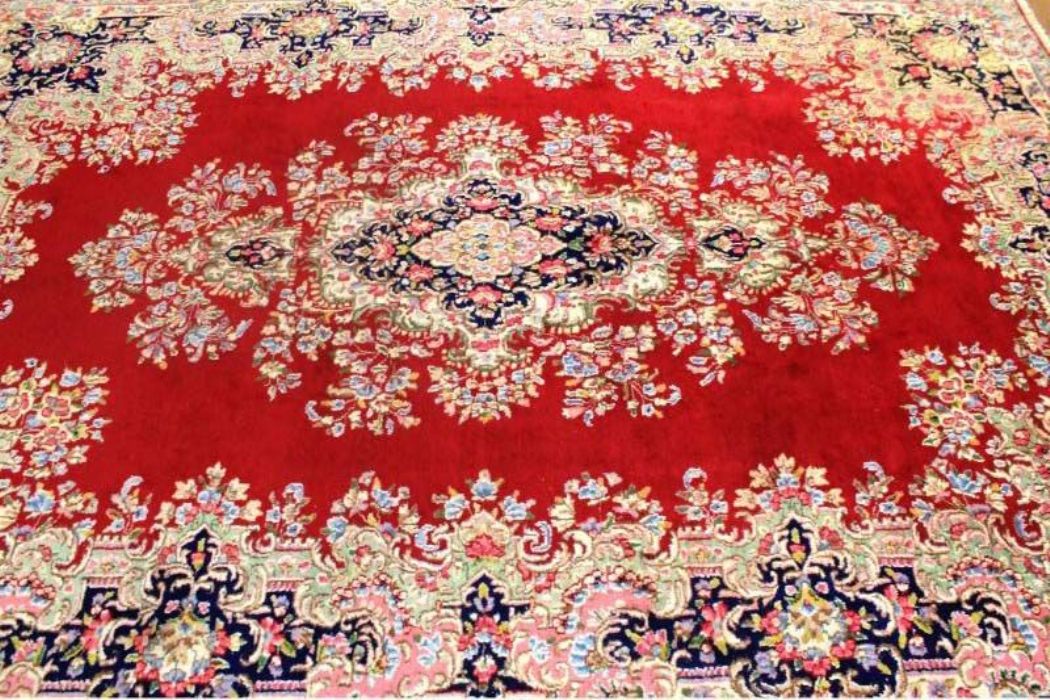 Raro e perfettamente conservato esemplare di antico KIRMAN (KIERMAN) IMPERIALE con decori a motivi floreali su classica campitura rosso cardinale. Eccezionale effetto naturalistico dei decori che danno spessore alla trama e all’orditura dei disegni. Il vello è in pura lana con trama e ordito in cotone, annodato completamente a mano. Ben conservate la bordatura e la frangia. Colori vegetali. Il tappeto, che è firmato , ha circa 60 anni.
