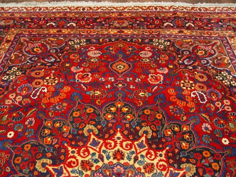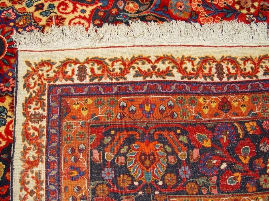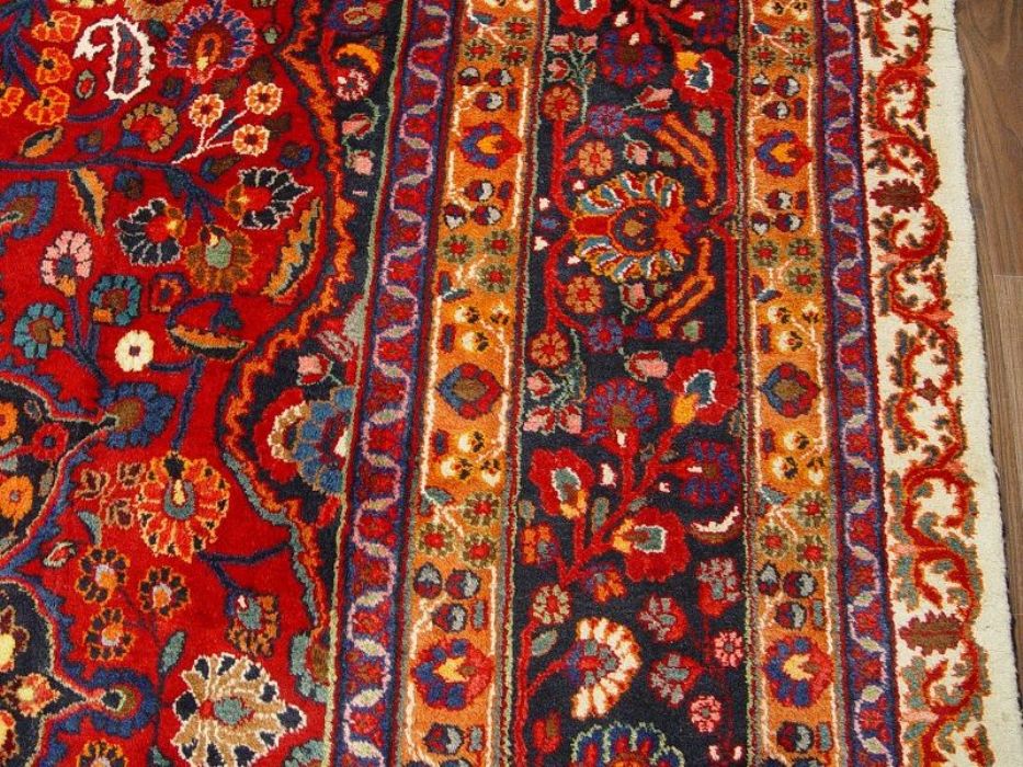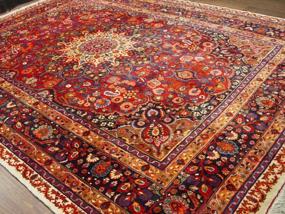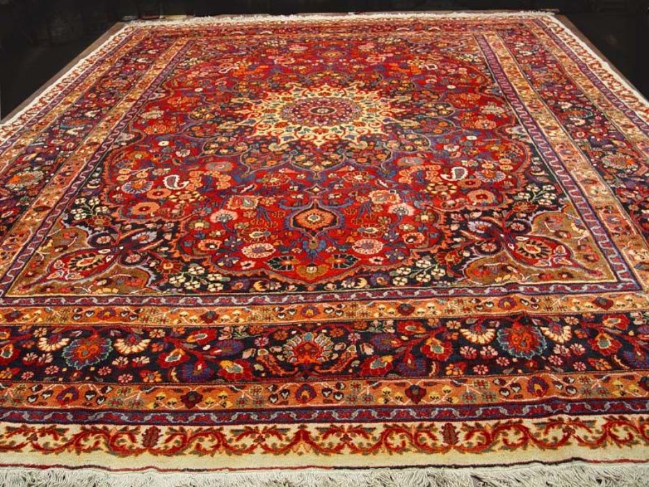Raro e grandioso antico MESCHAD-HORASAN di grandissime dimensione (quasi 14 metri quadrati). L’annodatura molto fitta evidenzia i particolari dei bellissimi decori floreali arricchiti da temi fantastici ch fanno apparire il tappeto come un’incredibile prato fiorito. Il medaglione centrale rotondo a contorni più chiari “ sporge” con l’effetto di una ninfea. Il Tappeto è in ottime condizioni il vello è in lana pura su trama e ordito in cotone. Lavato e igenizzato, presenta colori vegetali. Il tappeto ha circa 90 anni.