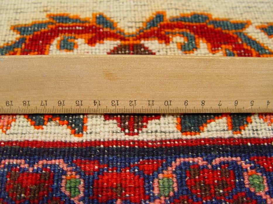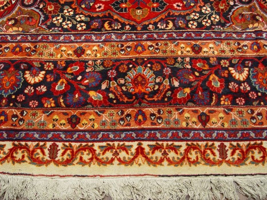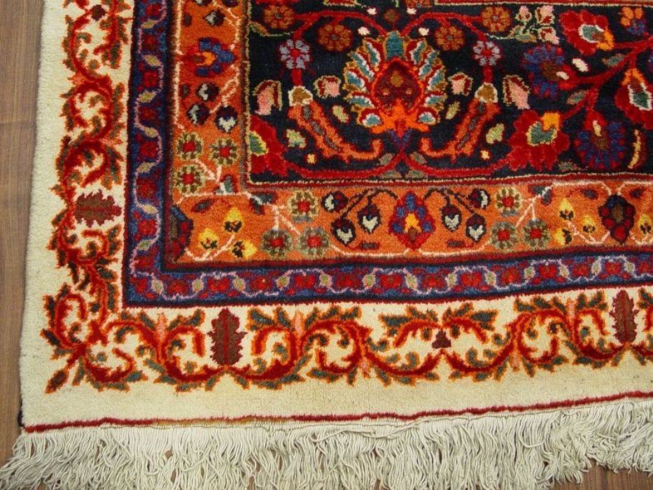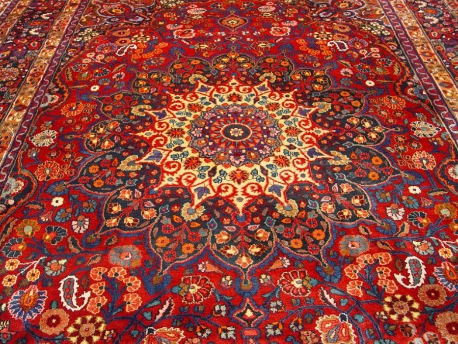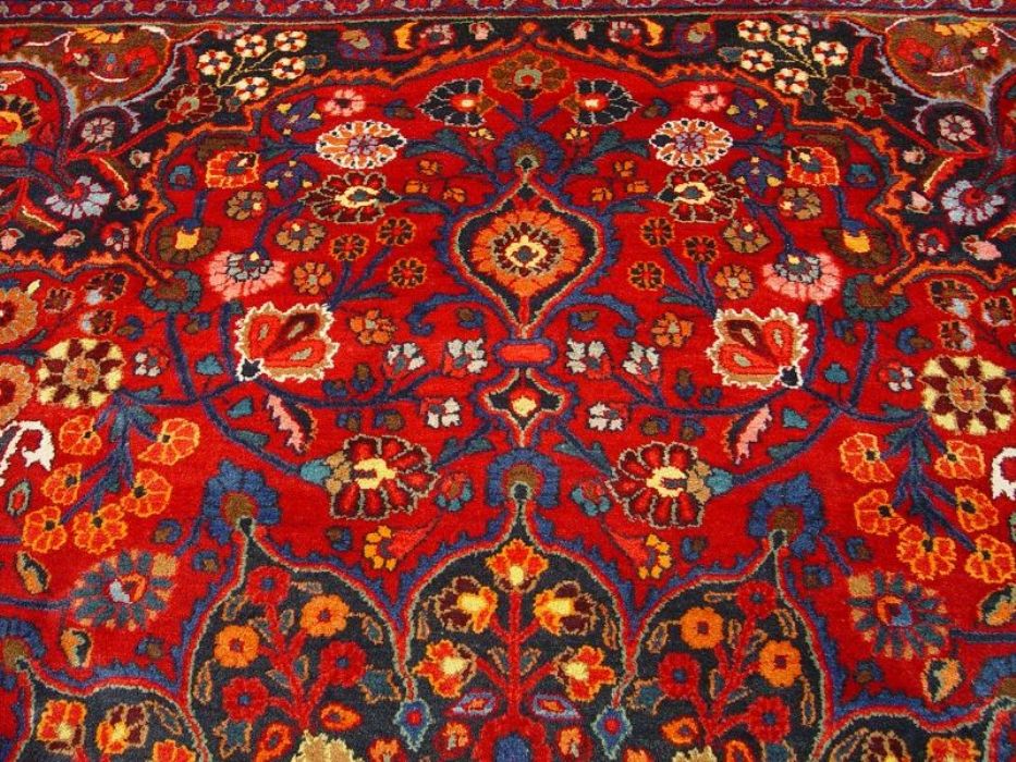 Raro e grandioso antico MESCHAD-HORASAN di grandissime dimensione (quasi 14 metri quadrati). L’annodatura molto fitta evidenzia i particolari dei bellissimi decori floreali arricchiti da temi fantastici ch fanno apparire il tappeto come un’incredibile prato fiorito. Il medaglione centrale rotondo a contorni più chiari “ sporge” con l’effetto di una ninfea. Il Tappeto è in ottime condizioni il vello è in lana pura su trama e ordito in cotone. Lavato e igenizzato, presenta colori vegetali. Il tappeto ha circa 90 anni.