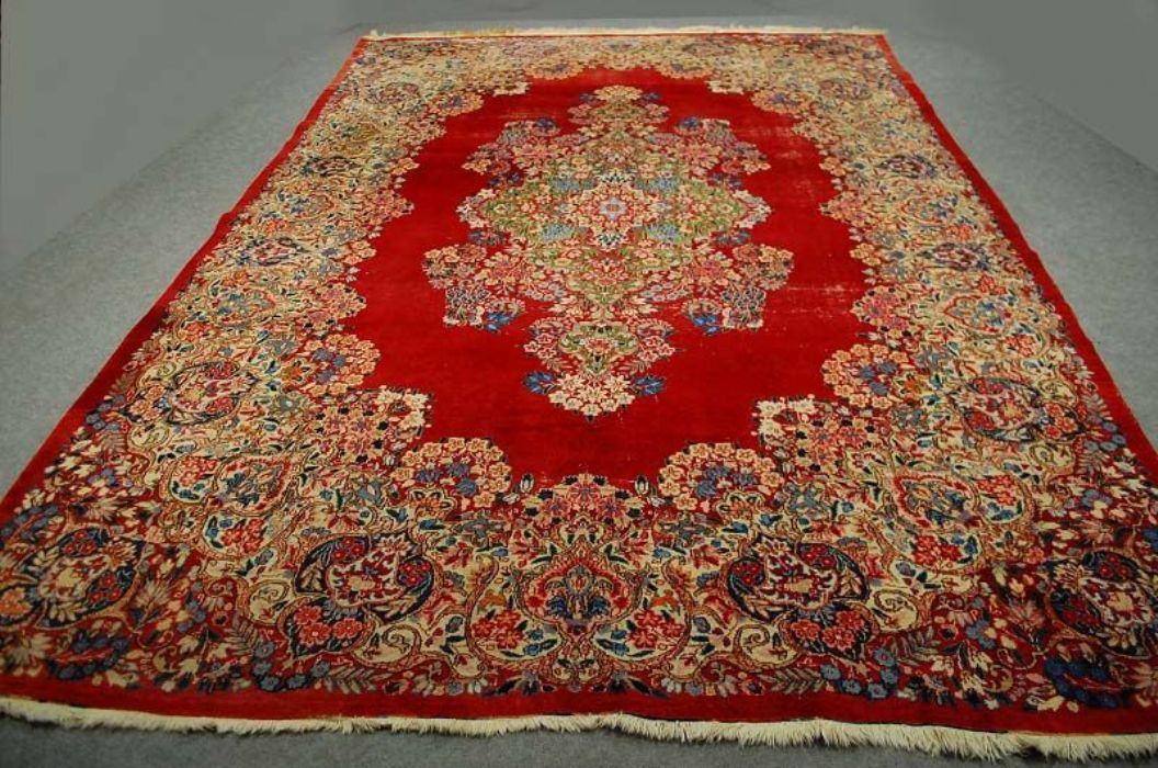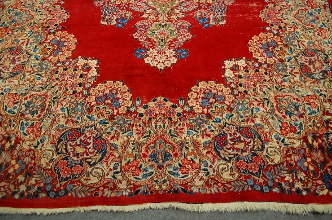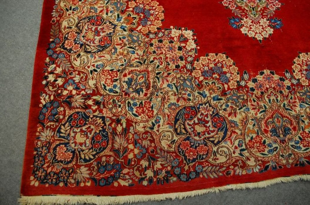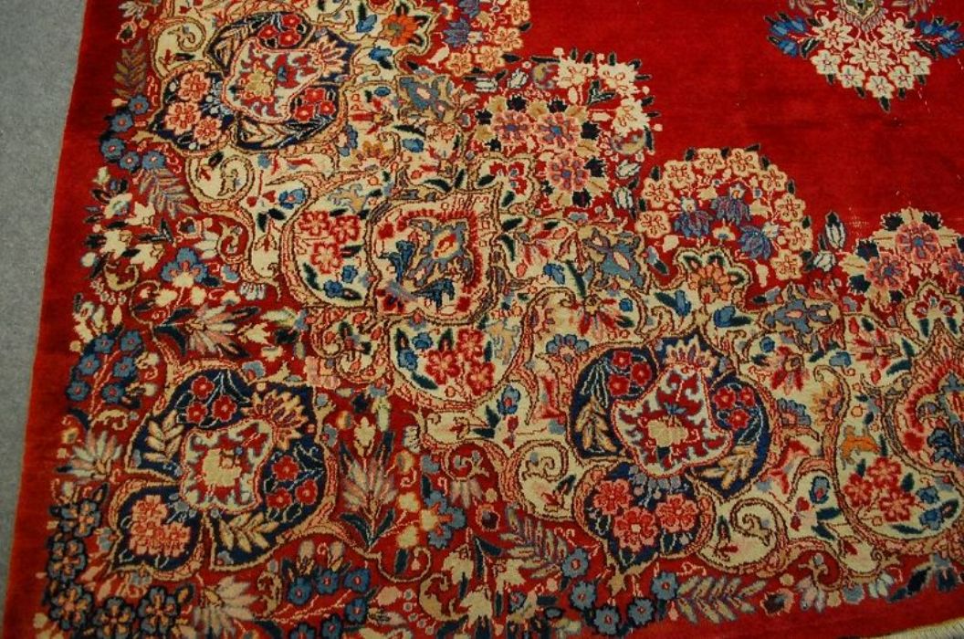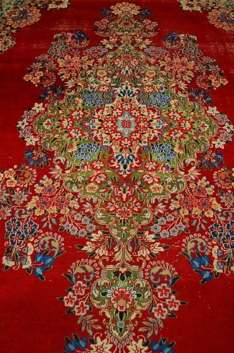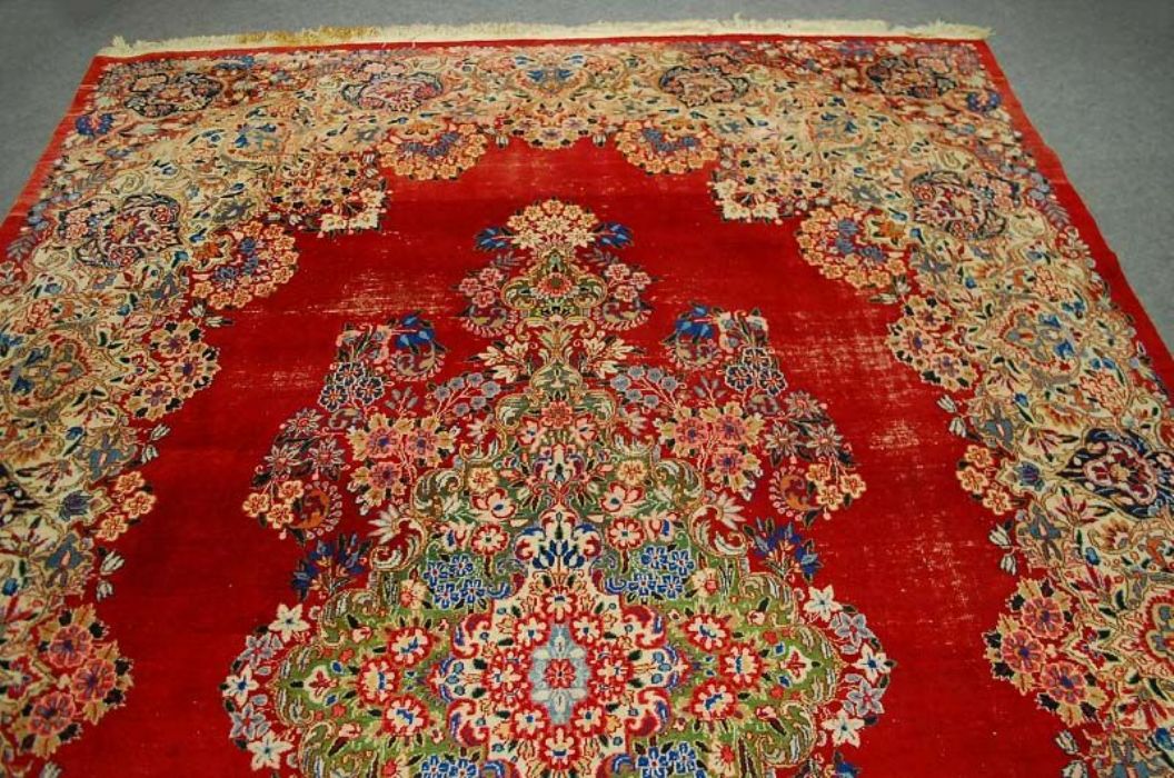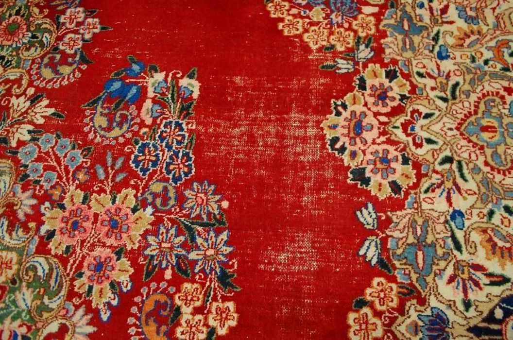 Bellissimo ed importante antico MESCHAD con stupendi decori floreali ad effetto tridimensionale su campitura interna monocromatica rosso scarlatto e grande “isola fiorita centrale” che ne esalta la spettacolarità. I leggeri segni di usura, fisiologici in un tappeto di questa età , ne accrescono il fascino. Il vello è in lana su trama e ordito in cotone, con colori vegetali, frange e bordatura in buone condizioni. Lavato e igienizzato. Il tappeto ha circa 70 anni.