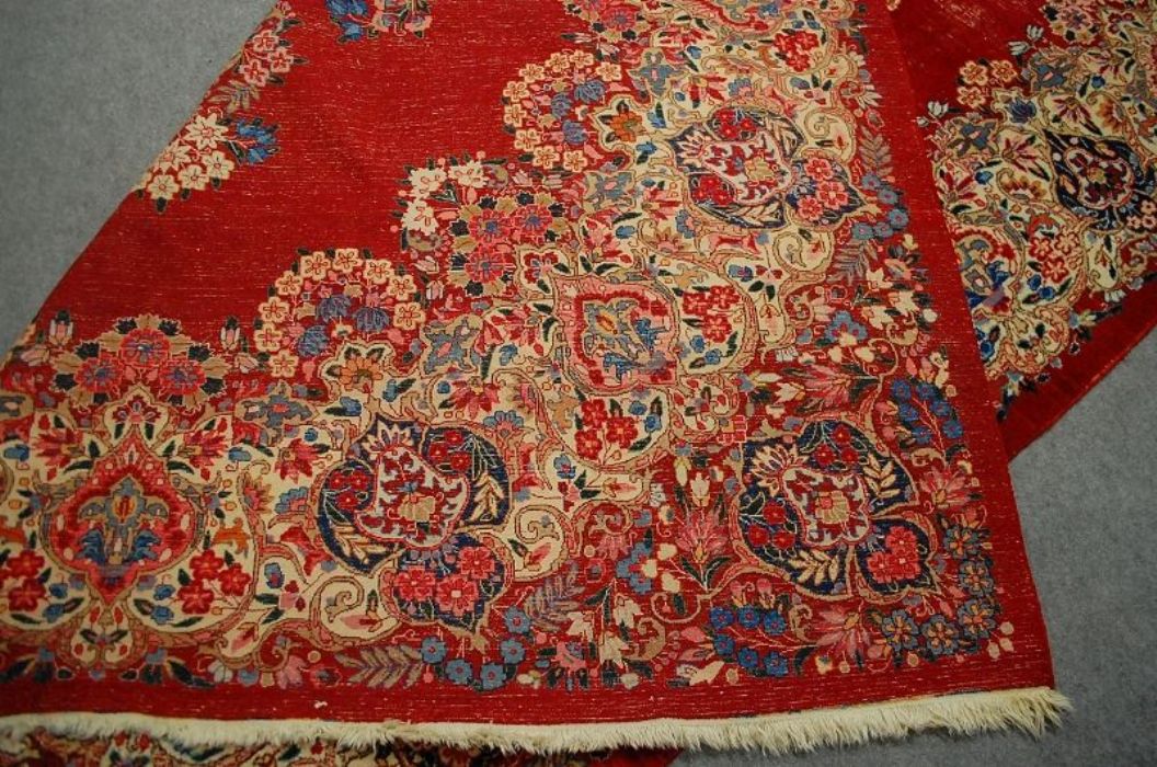 MERAVIGLIOSO E ANTICO MESCHAD PERSIANO A DECORI FLOREALI SU ROSSO SCARLATTO - 252x370 cm.