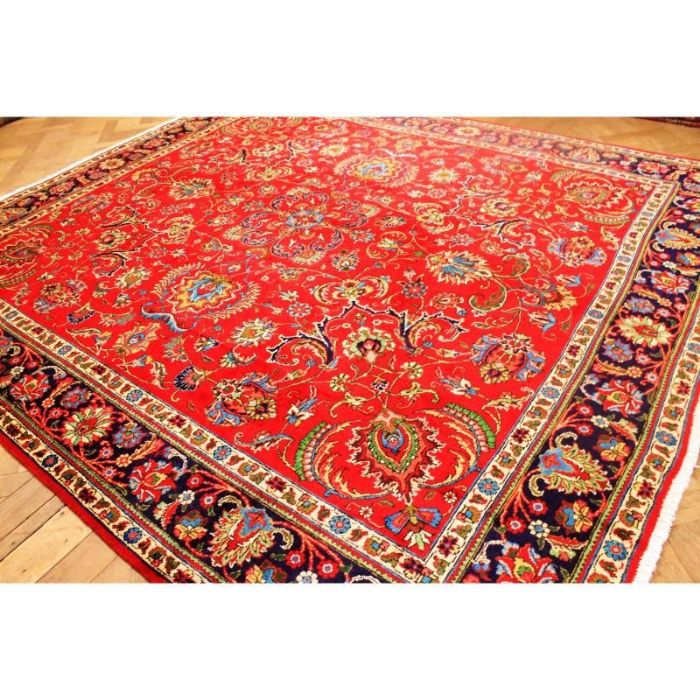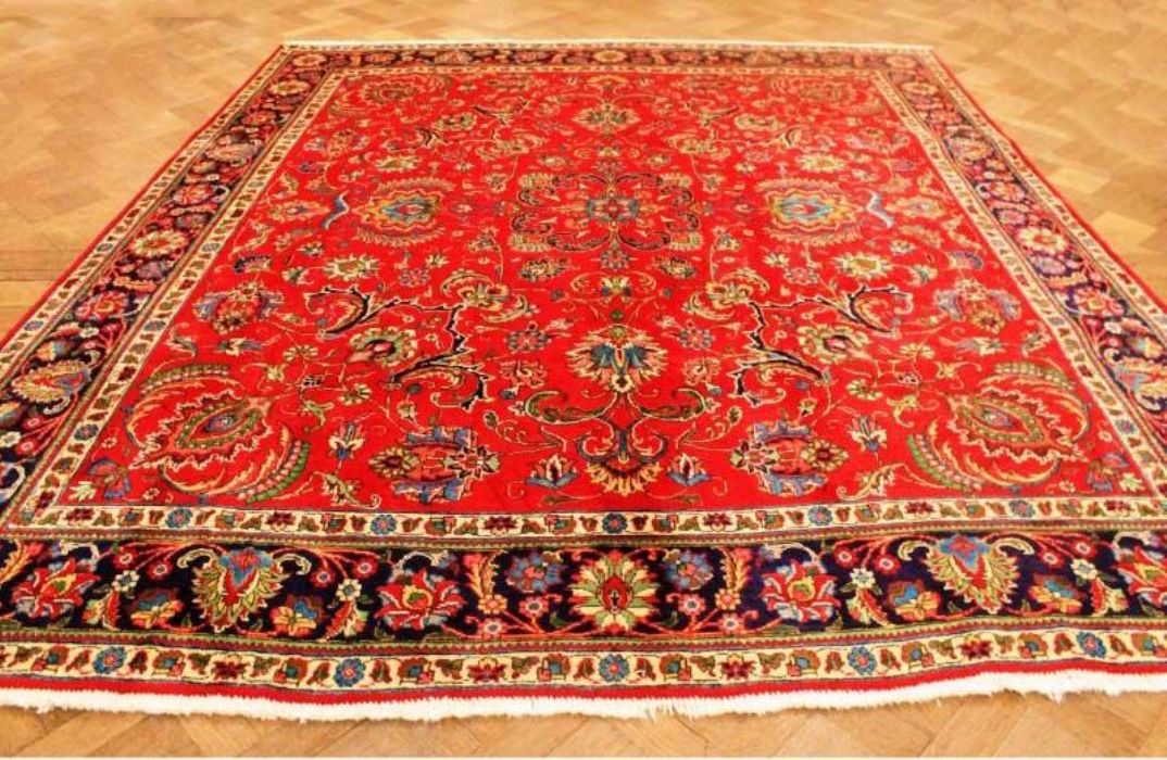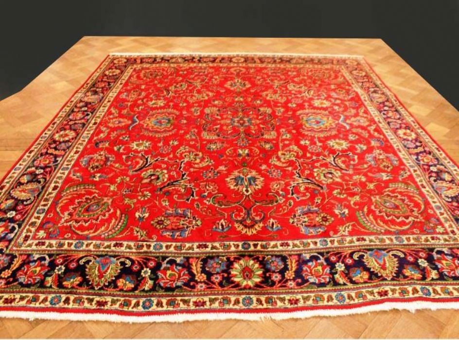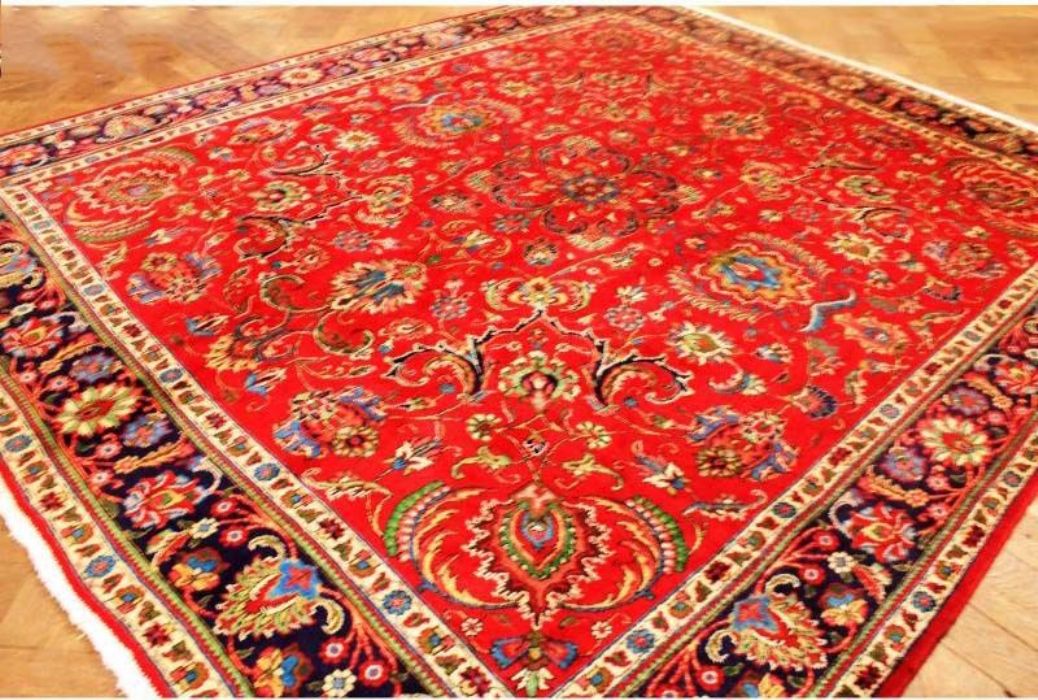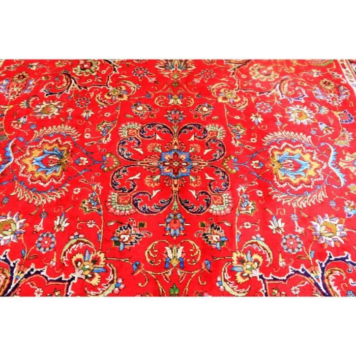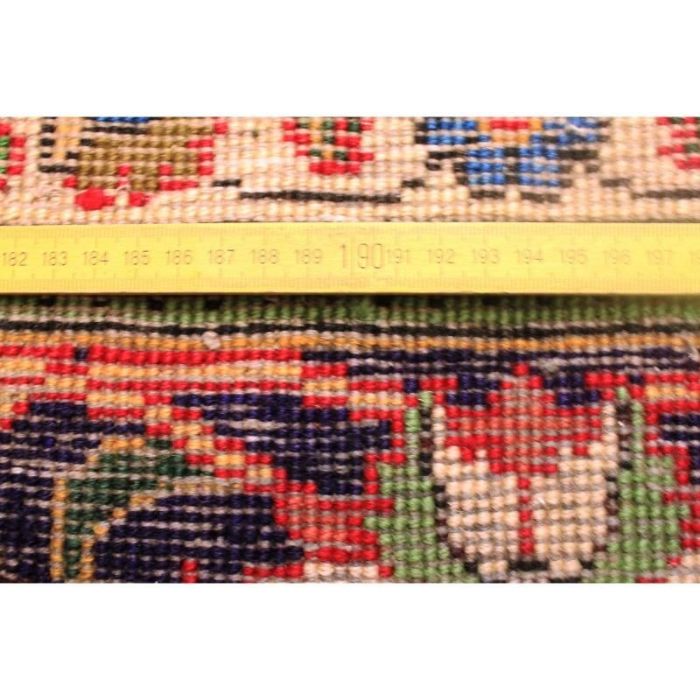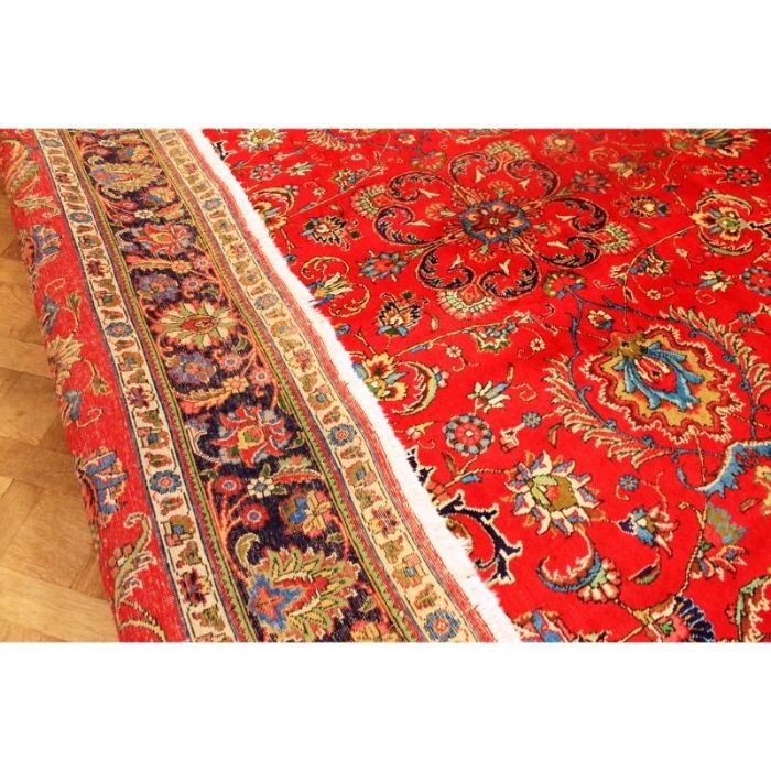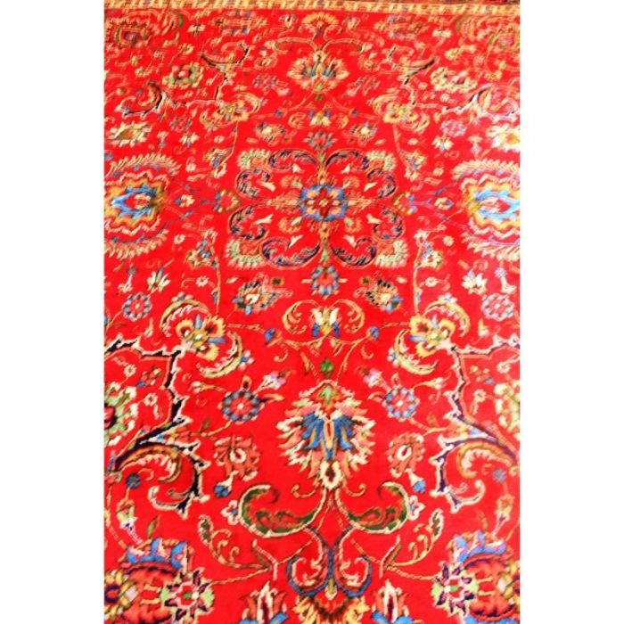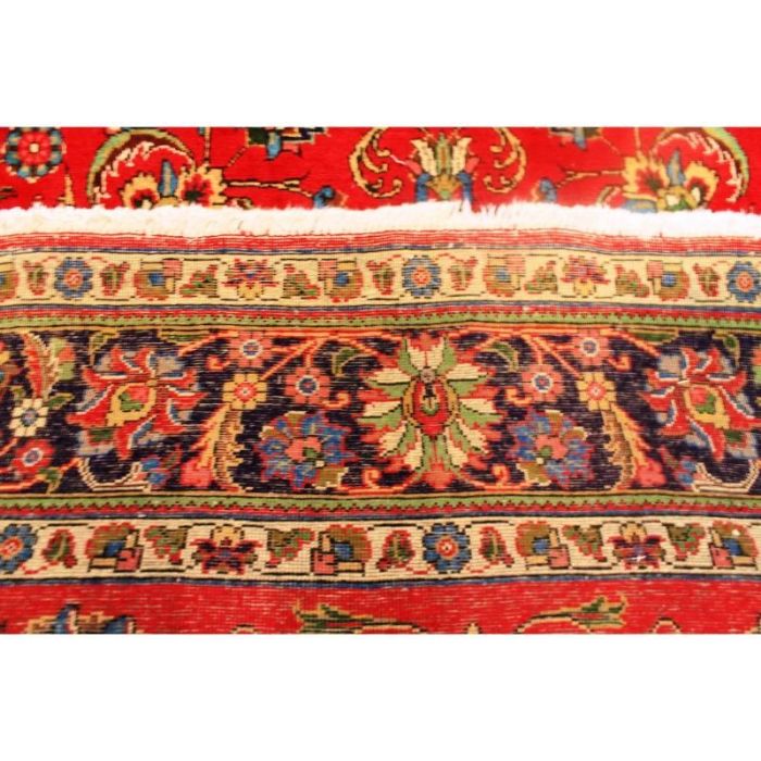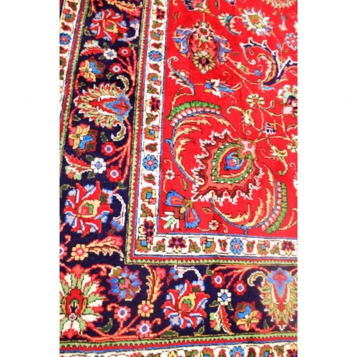 L’effetto decorativo di questo bellissimo TABRIZ – QOUM (QOM) è garantito dalla freschezza dei colori su vivaci tonalità del rosso con bordature nelle quali spicca un blu cobalto di fondo che rende tridimensionali gli altri colori. Il vello è in lana con trama e ordito in cotone e colori vegetali. L’annodatura è a mano particolarmente fitta. Il tappeto, in perfette condizioni, lavato e igienizzato, ha circa 30/40 anni.