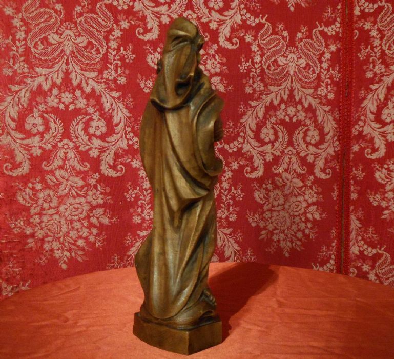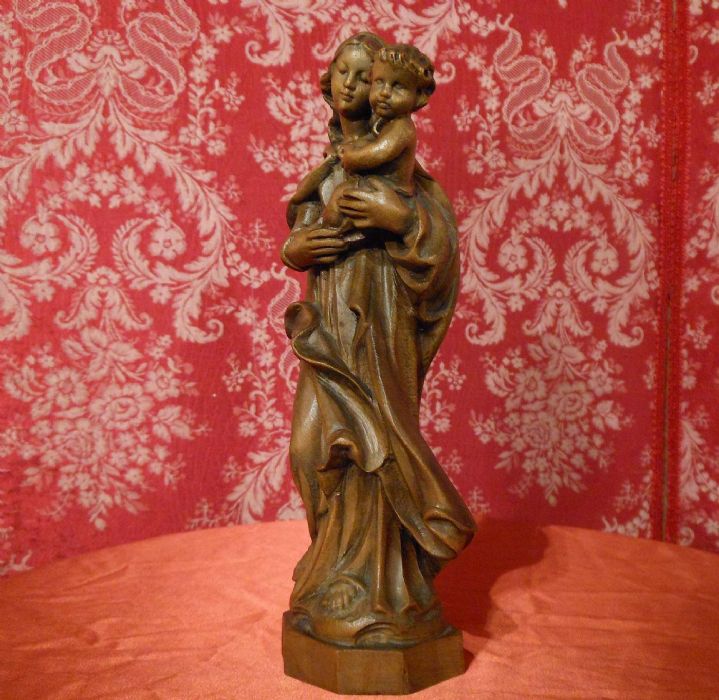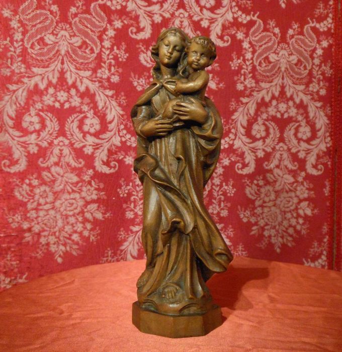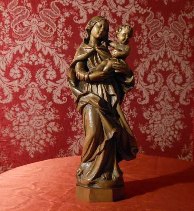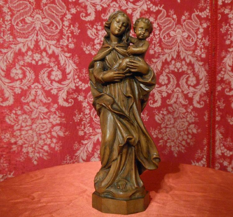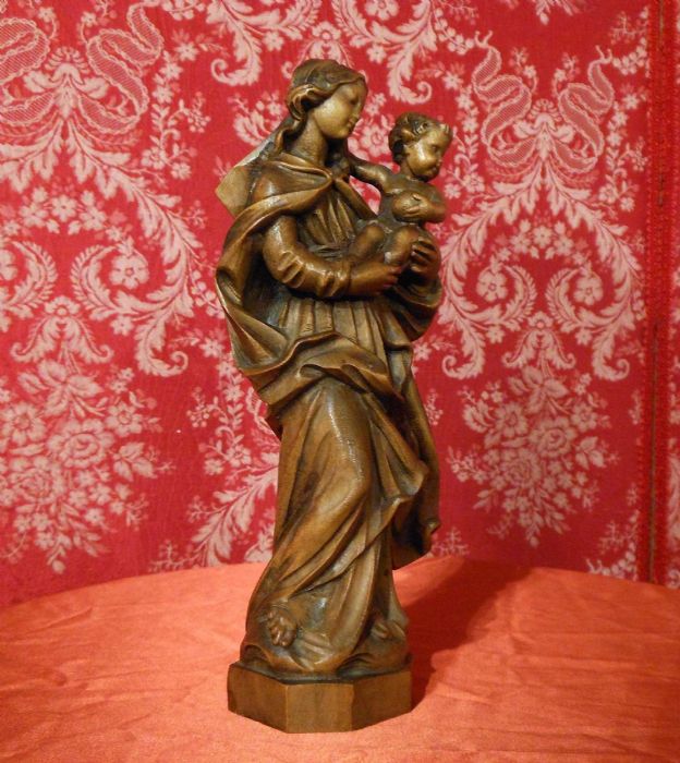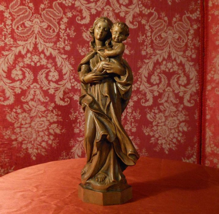 Alquanto raffinata piccola scultura a tutto tondo raffigurante una bella Madonna col Bambino di ispirazione tradizionale. La scultura si presenta finemente lavorata con panneggi di particolare leggerezza che accrescono il senso etereo e la leggerezza dell'insieme.